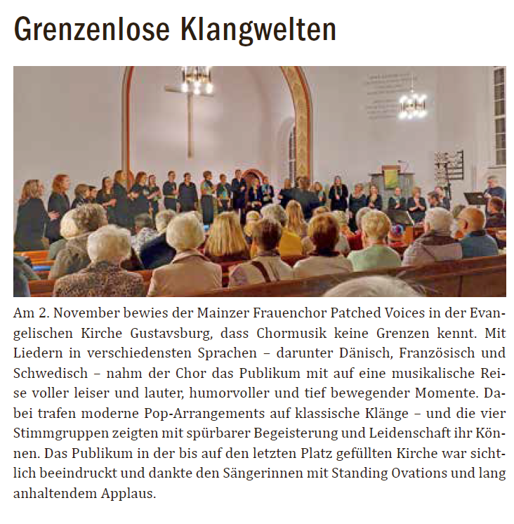 Bis auf den letzten Platz gefüllt fand am 12. November in der evangelischen Kirche in Gustavsburg das Konzert des Frauenchors Patched Voices statt. Mit einer eklektischen Mischung verschiedener Genres führte das Ensemble durch einen bunten Abend.